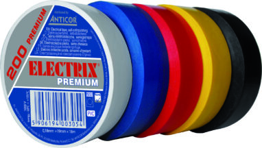 Taśma elektroizolacyjna ELECTRIX 200 PCW klasy PREMIUM, wysoce elastyczna, samogasnąca, mrozoodporna, wodoodporna, odporna na: wpływy atmosferyczne (UV, ozon), starzenie, roztwory mydła. Wysoce odporna na: oleje, kwasy, zasady i korozję. Dostępna w 5 kolorach: czarny, czerwony, niebieski, biały i żółty oraz w zestawach „tęcza”.