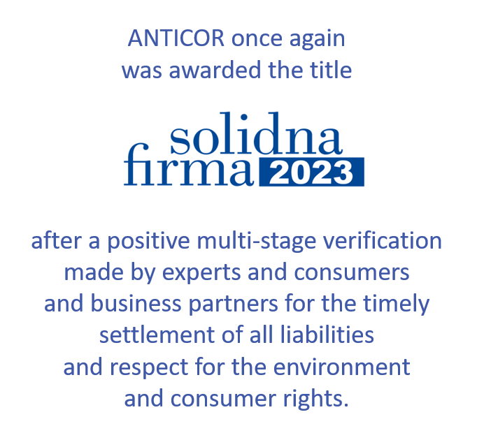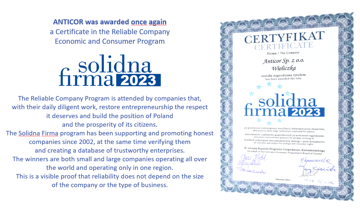 We are pleased to announce that ANTICOR has again been awarded the Reliable Company certificate. We are even more pleased to receive this title continuously since 2004. For us, it is a confirmation that our work, commitment to the development of the company and the values we follow are noticed and appreciated by experts. This award is a credit to our entire team and contractors with whom we have been cooperating for many years. Thank you!