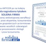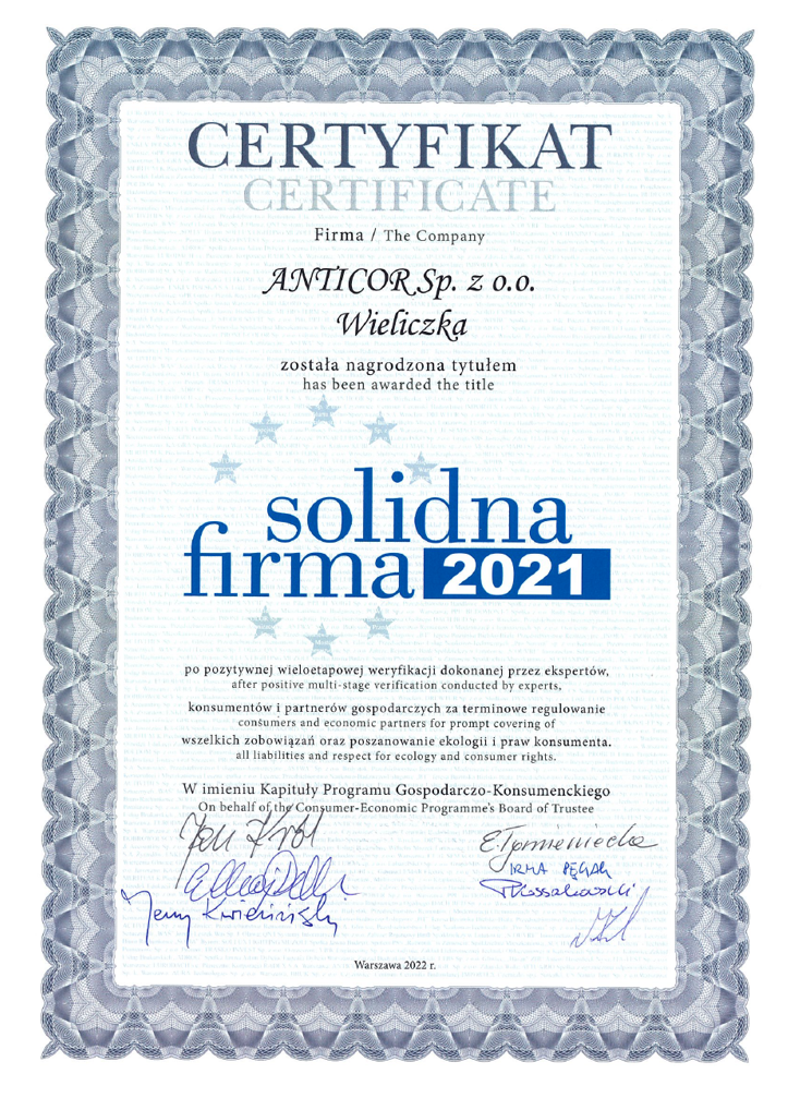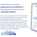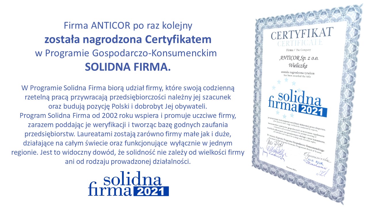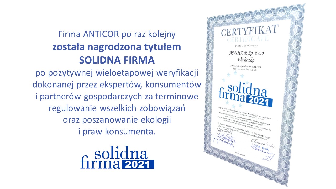Z przyjemnością informujemy, że firma ANTICOR ponownie została nagrodzona certyfikatem Solidna Firma. Cieszy nas to tym bardziej, że tytuł ten otrzymujemy nieprzerwanie od 2004 roku. Dla nas to potwierdzenie, że nasza praca, zaangażowanie w rozwój firmy oraz wartości jakimi się kierujemy są zauważane i doceniane przez ekspertów.