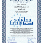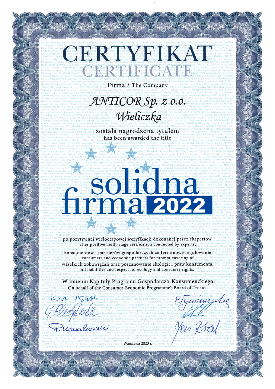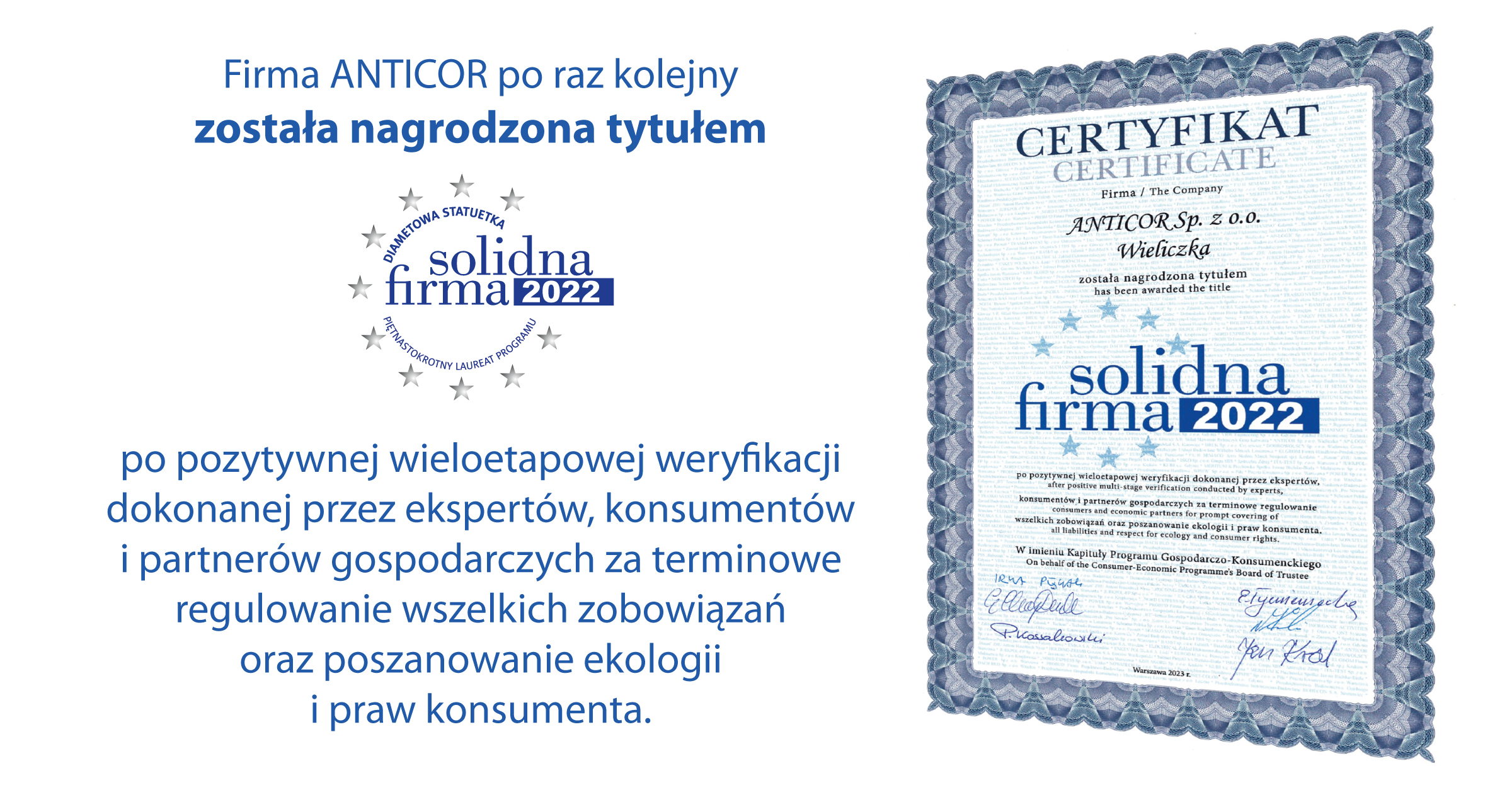 Z przyjemnością informujemy, że firma ANTICOR ponownie została nagrodzona certyfikatem SOLIDNA FIRMA 2022 wraz z diamentową statuetką. Taką prestiżową nagrodę otrzymują firmy, które po raz 15-ty przeszły pozytywnie proces weryfikacji w zakresie terminowo rozliczanych zobowiązań oraz poszanowania ekologii i praw konsumenta. Jest to dla nas potwierdzenie, że codzienna praca, podejmowanie ambitnych projektów i inwestowanie w nowe technologie, a także rozwój są zauważane i doceniane przez ekspertów.